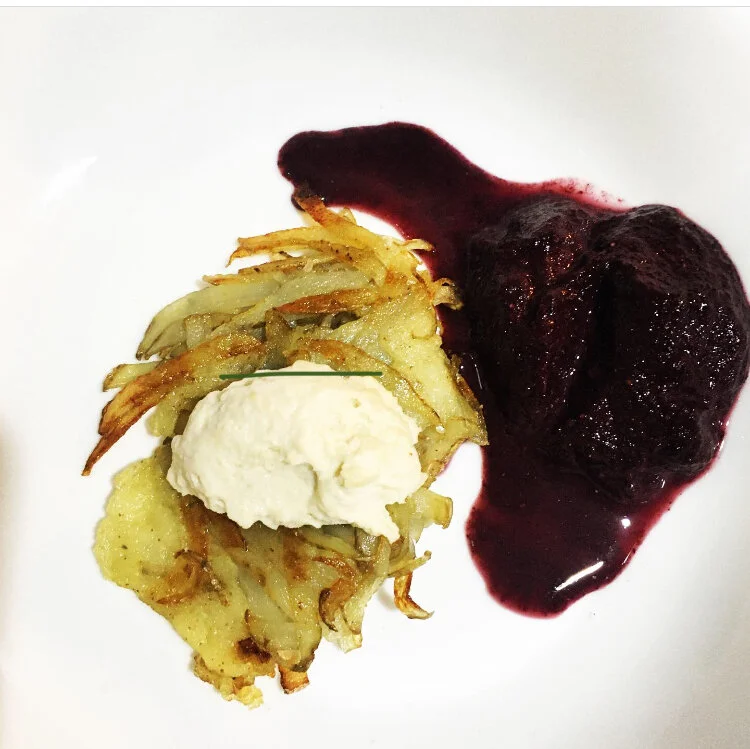 Add salt and pepper onto the latkes/pancakes/jun. And there you have it — a savory, crunchy, yummy potato treat with a ginger-y blueberry sauce. The ginger offsets not only the sweetness of the berries, but the oily texture of the potatoes.