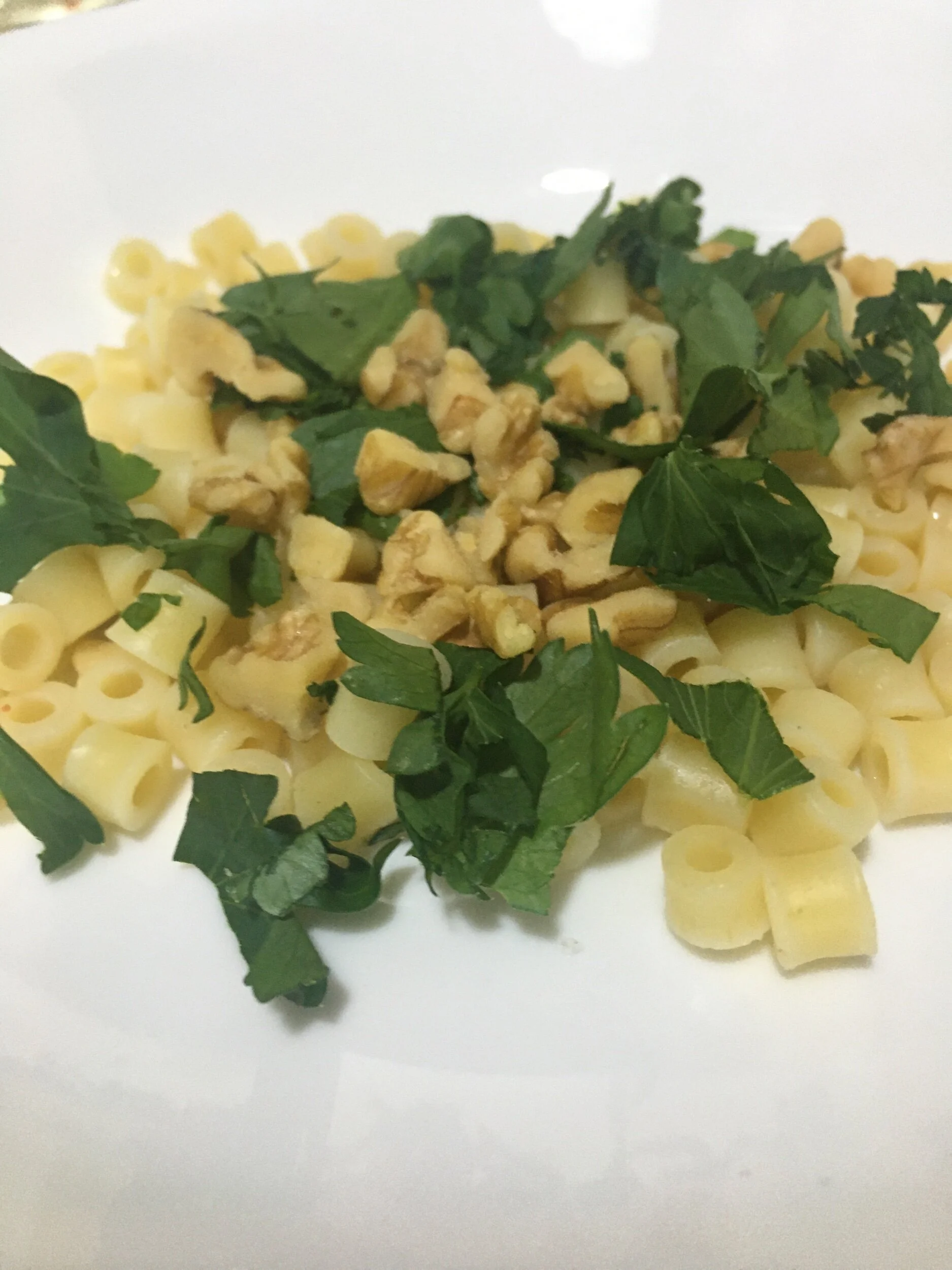 My latest obsession is the ditalini pasta. They are tiny and quick to get to al dente mode. Once drained through a colander, I place in a large bowl. I then throw in some walnut pieces from a bag. Then snip, snip whatever herbs you have (I had plenty of parsley). And you are ready to have a bowl of pasta ready to eat.
