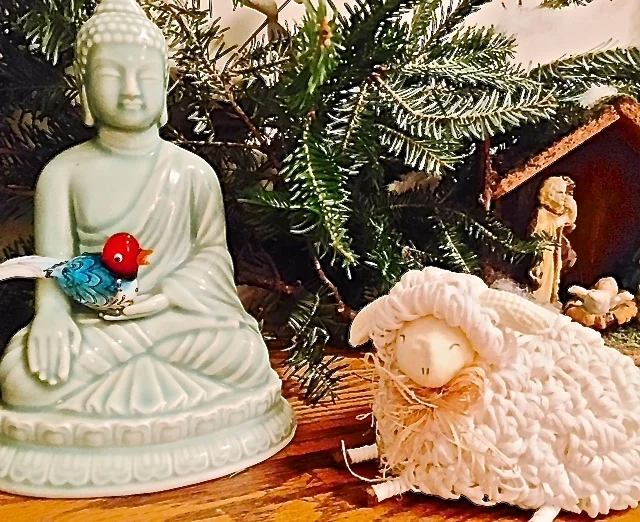 Bring a little serenity to your holiday decorations by replacing Santa with Buddha. It sounds a bit sacrilege but the visual is calming. Friends of Buddha: Rudolph, Frosty, and Little Lamb.